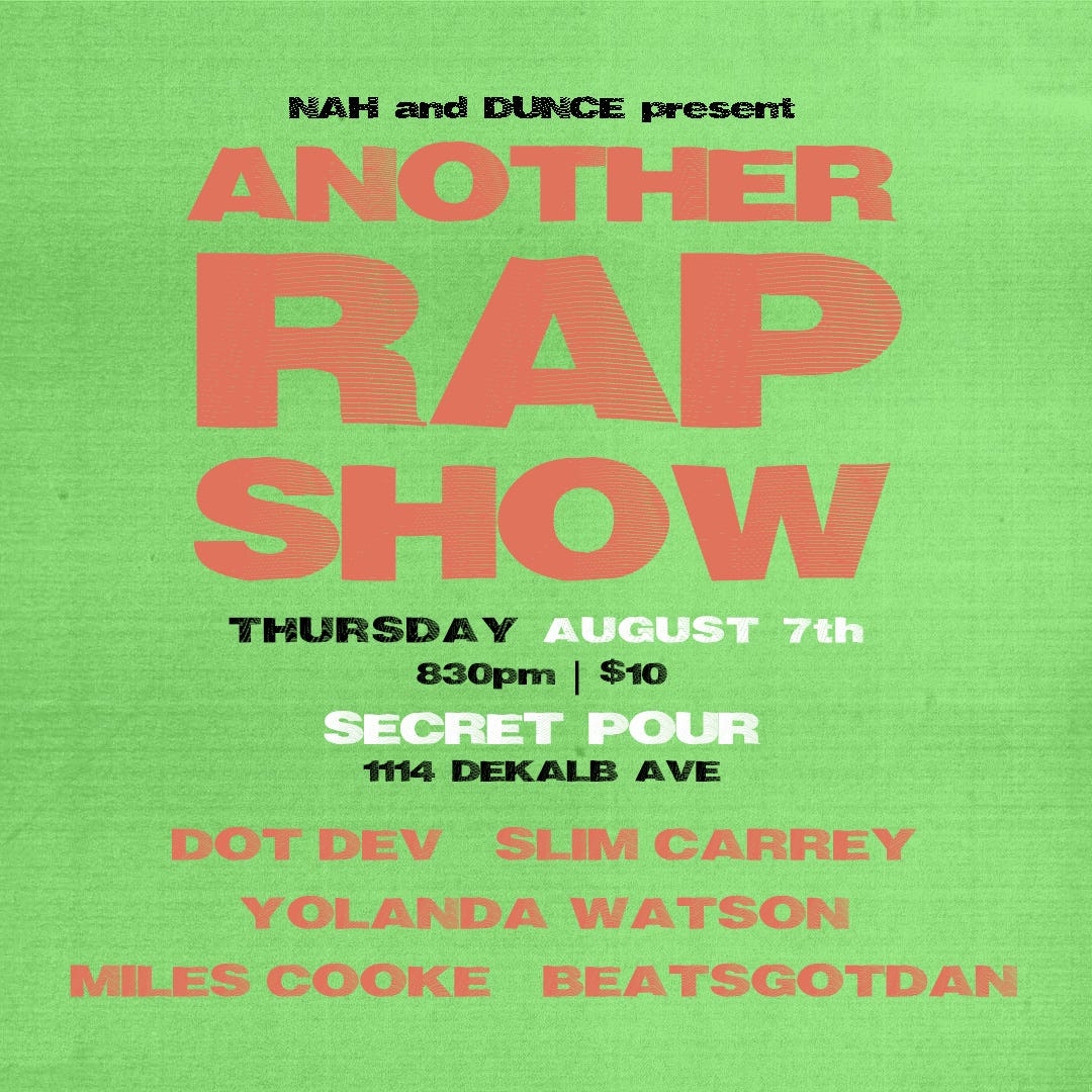 Let’s start with the most immediate (like, tomorrow or tonight immediate): Another Rap Show #13 on Thursday August 7th at Secret Pour in Brooklyn featuring Dot Dev, Slim Carrey, miles cooke, Yolanda Watson, and Beatsgotdan. If you’re in NYC, this lineup is one you definitely do not want to miss. It’s wild to think it’s been almost two years since our first show in September 2023—if you haven’t been to one of these yet, now would be a good time to start coming.