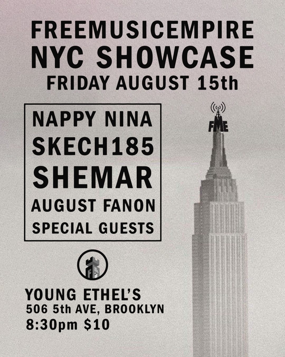 On August 15th, I’m helping DanO and K from FREEMUSICEMPIRE put on their FME NYC SHOWCASE. This one is at Young Ethel’s in Park Slope (Brooklyn), and this is also a lineup you do not want to miss featuring Skech185, Nappy Nina, Shemar, August Fanon, and several special guests. DanO and K do so much for independent rap through their podcast, so I’m extra excited to have a way to give back and help them put on this show.